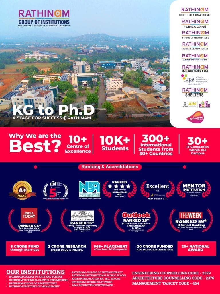 Rathinam, as a premium Institution is known for its unique quality of Education. Rathinam Group is the only institute that brings education, information technology (IT) development, and infrastructure development under one roof. The Group offers various traditional and modern courses to aspiring students who come from across the globe.