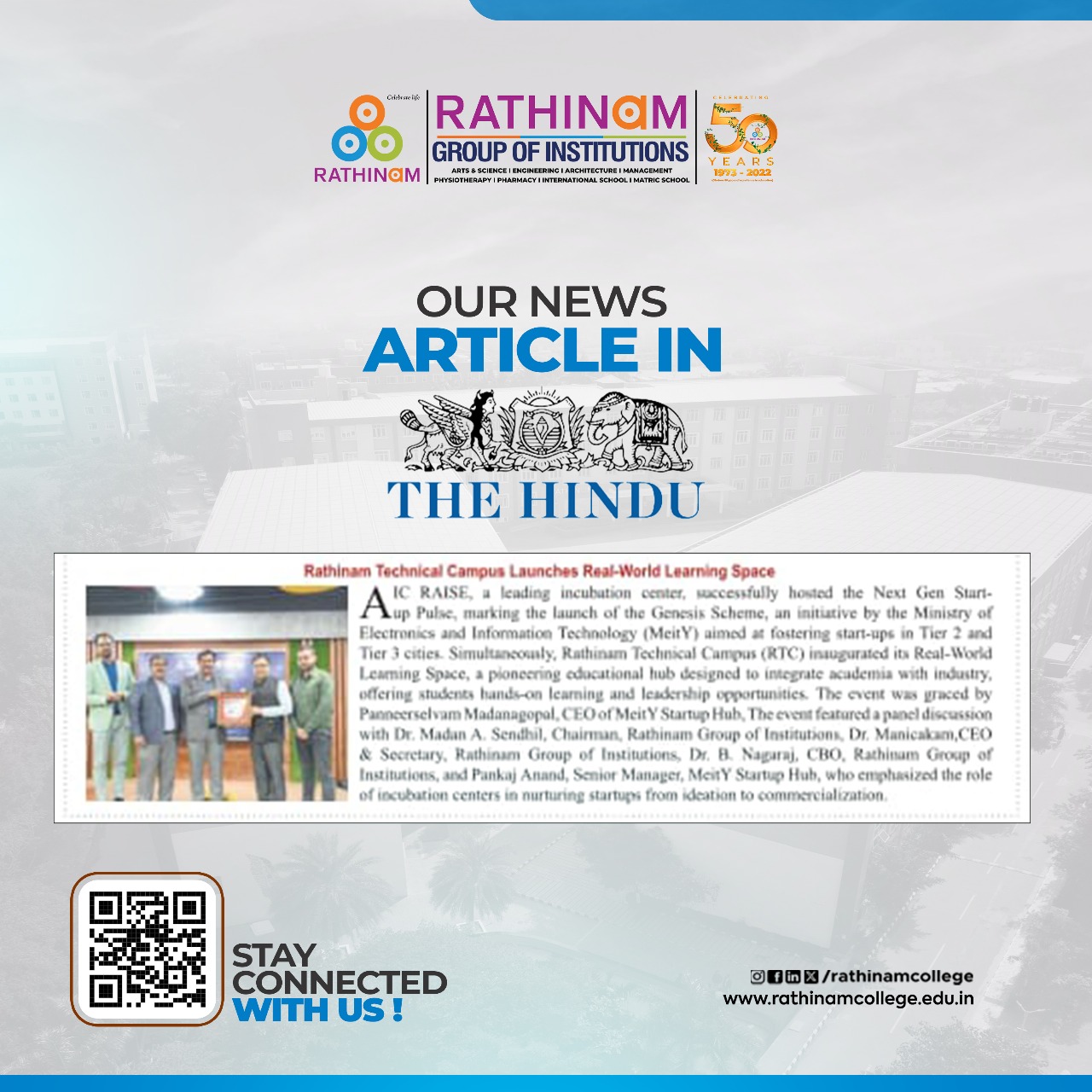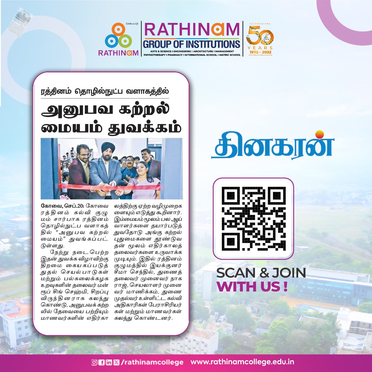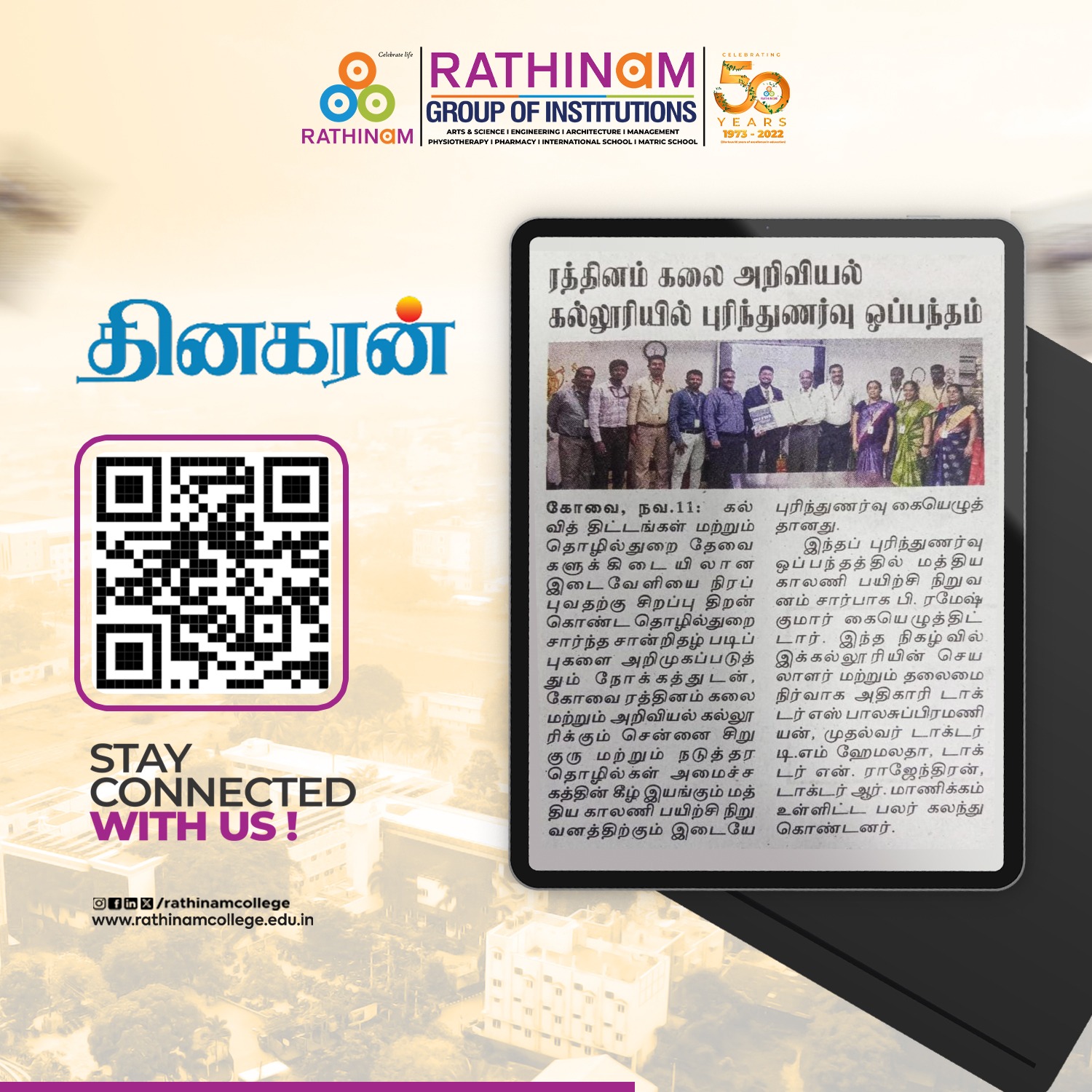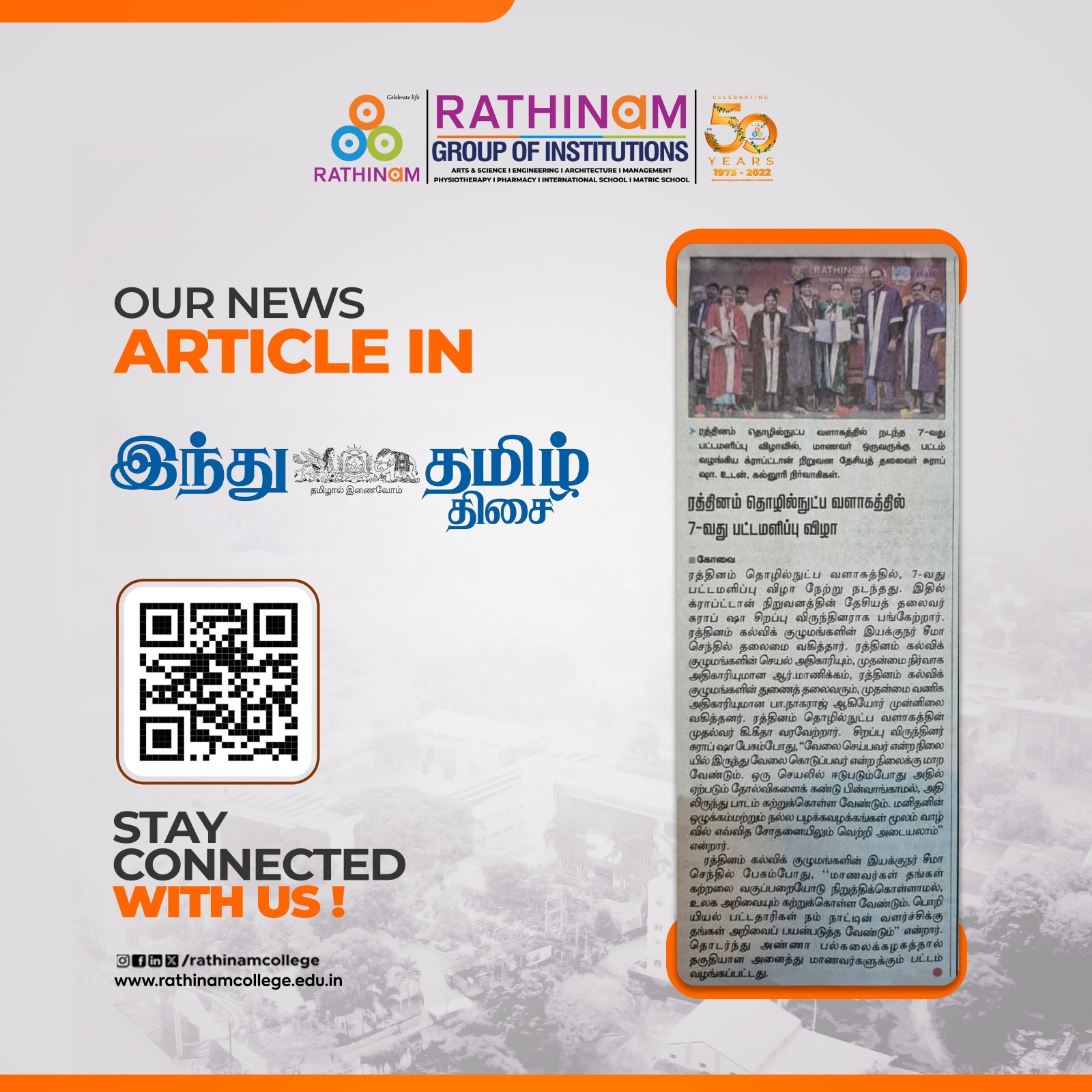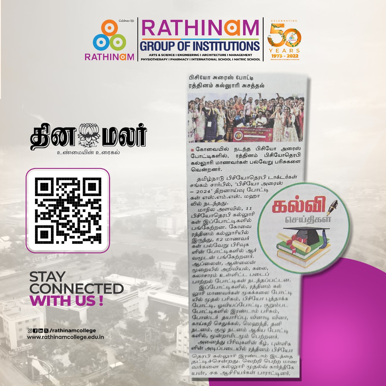 Rathinam College is one of the Best Colleges in Coimbatore, Tamilnadu. As a Top College in Coimbatore, We offer Arts & Science, Engineering, Management, Architecture & Physiotherapy courses. Rathinam began its journey more than 40 years ago with a vision to create an educational community with a global outlook. The dream kick-started when K.P.M Matriculation School was established in Eachanari, Coimbatore.