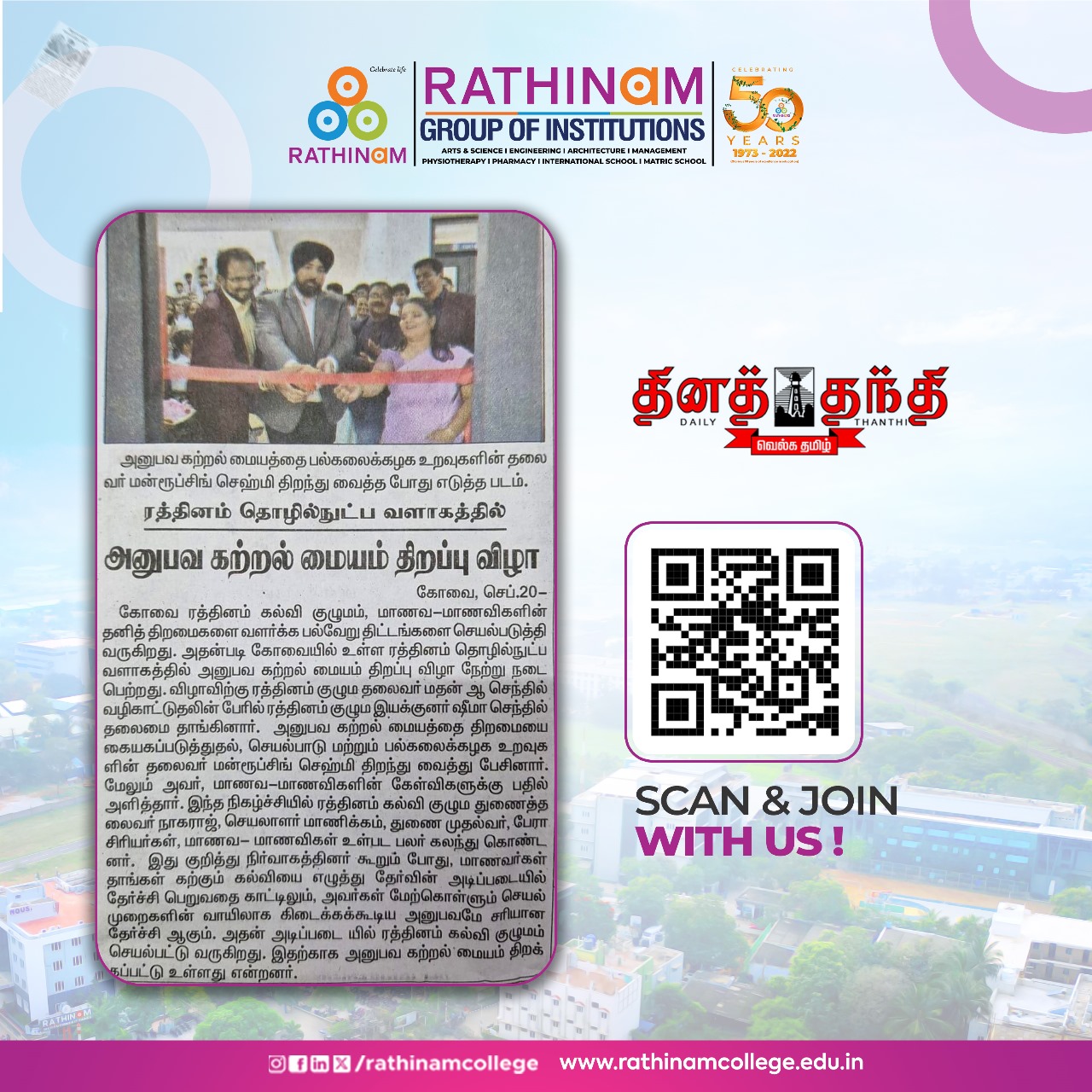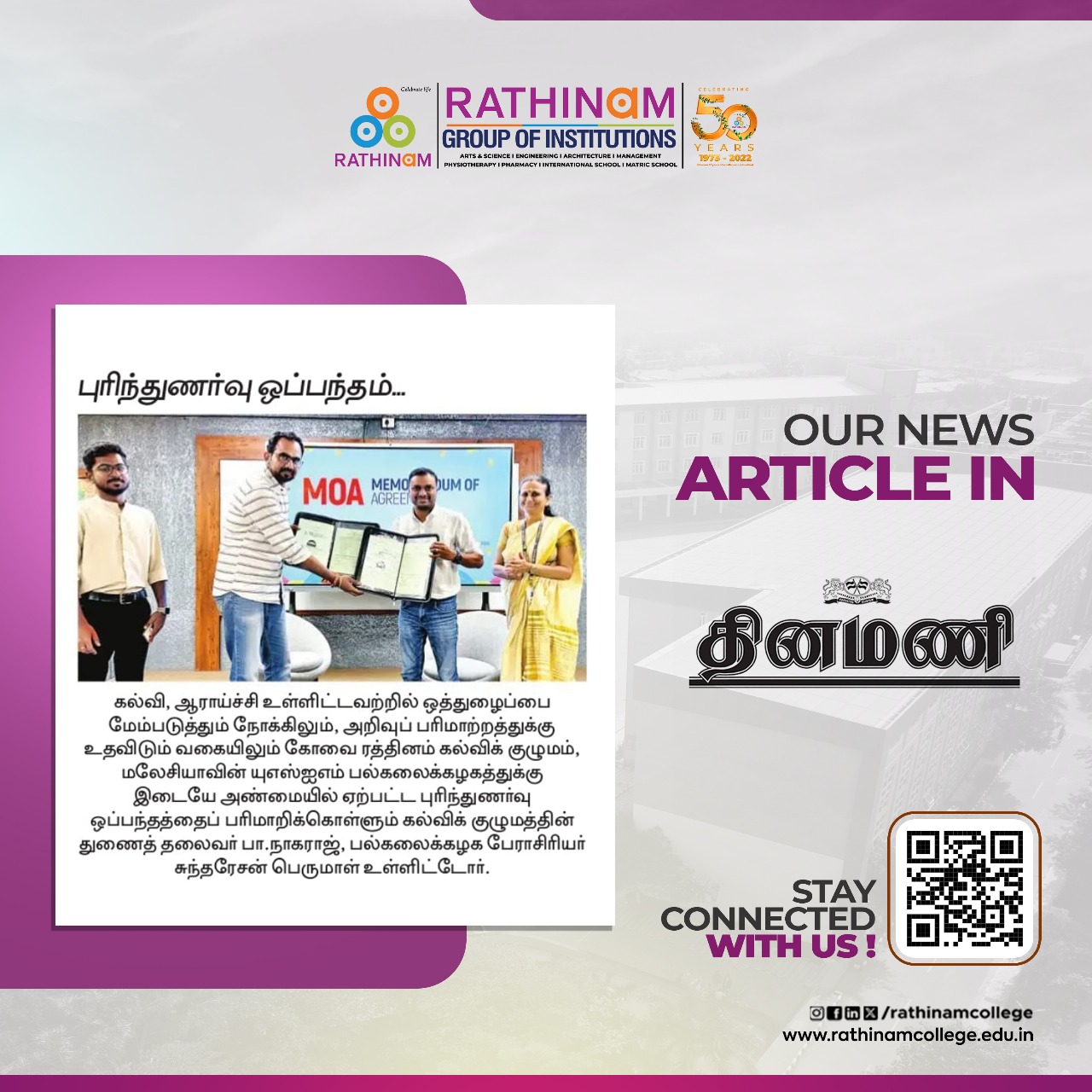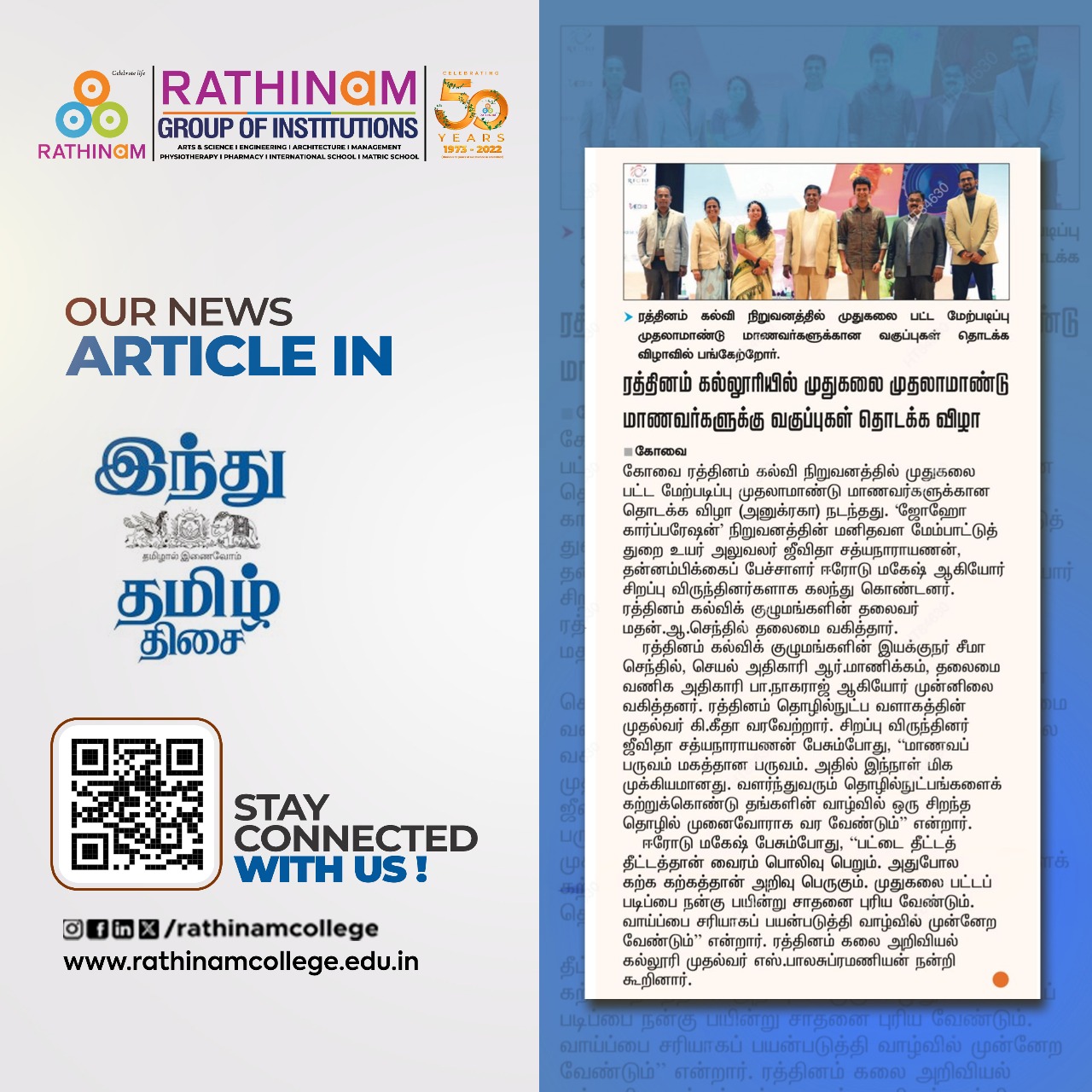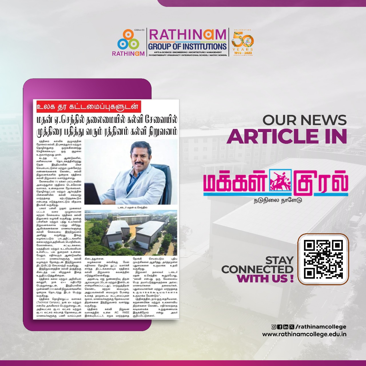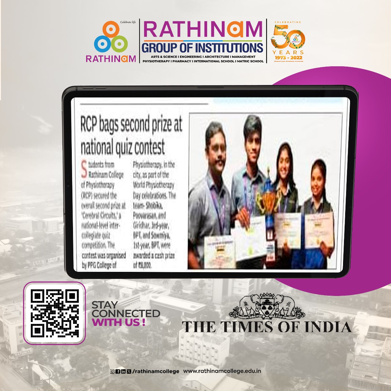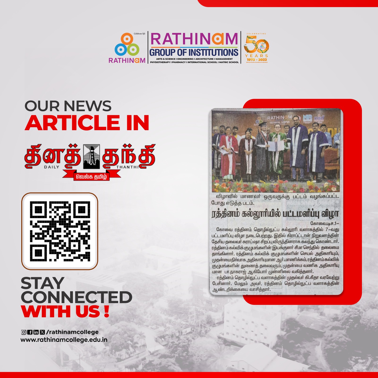 Rathinam College is one of the Best Colleges in Coimbatore, Tamilnadu. As a Top College in Coimbatore, We offer Arts & Science, Engineering, Management, Architecture & Physiotherapy courses. Rathinam began its journey more than 40 years ago with a vision to create an educational community with a global outlook. The dream kick-started when K.P.M Matriculation School was established in Eachanari, Coimbatore.