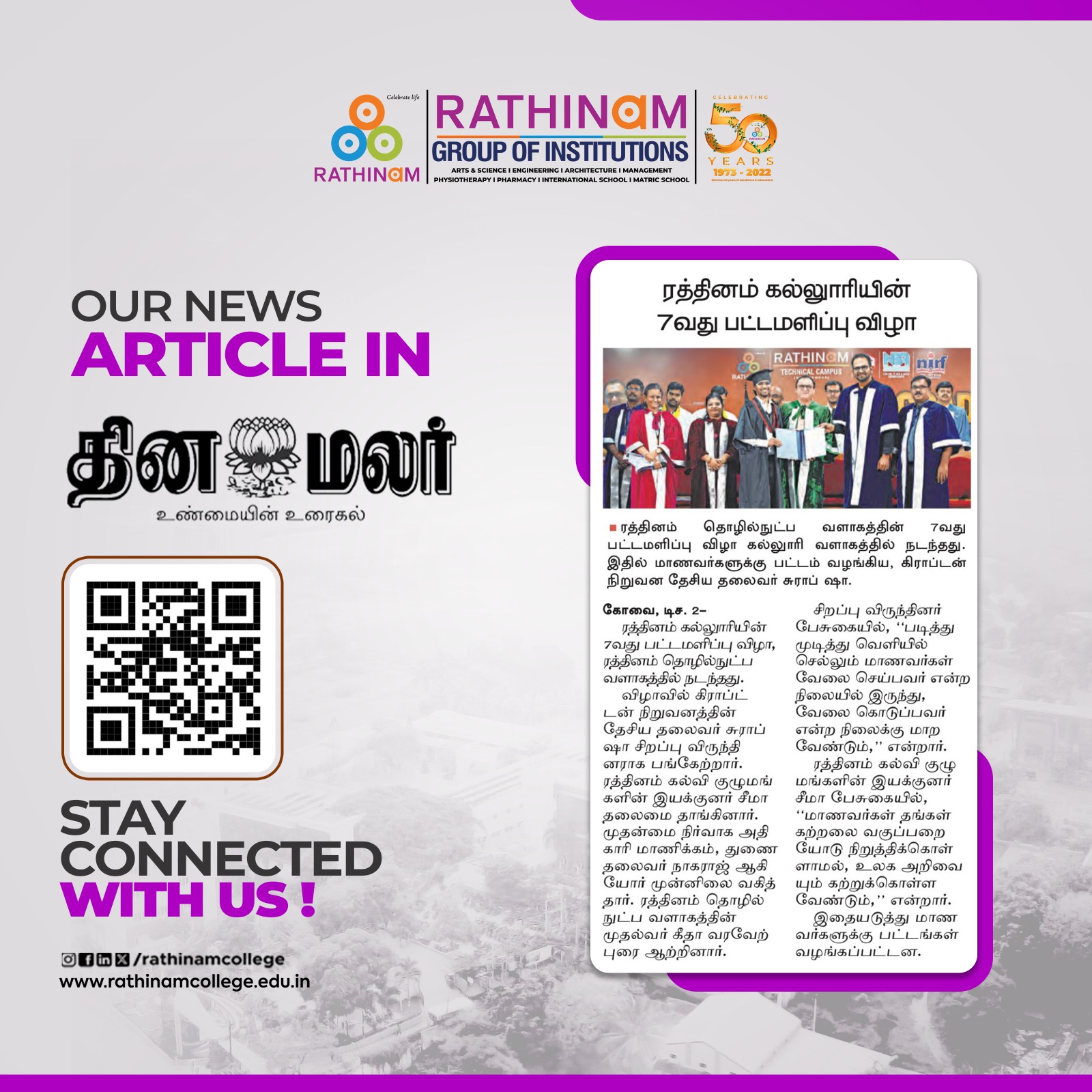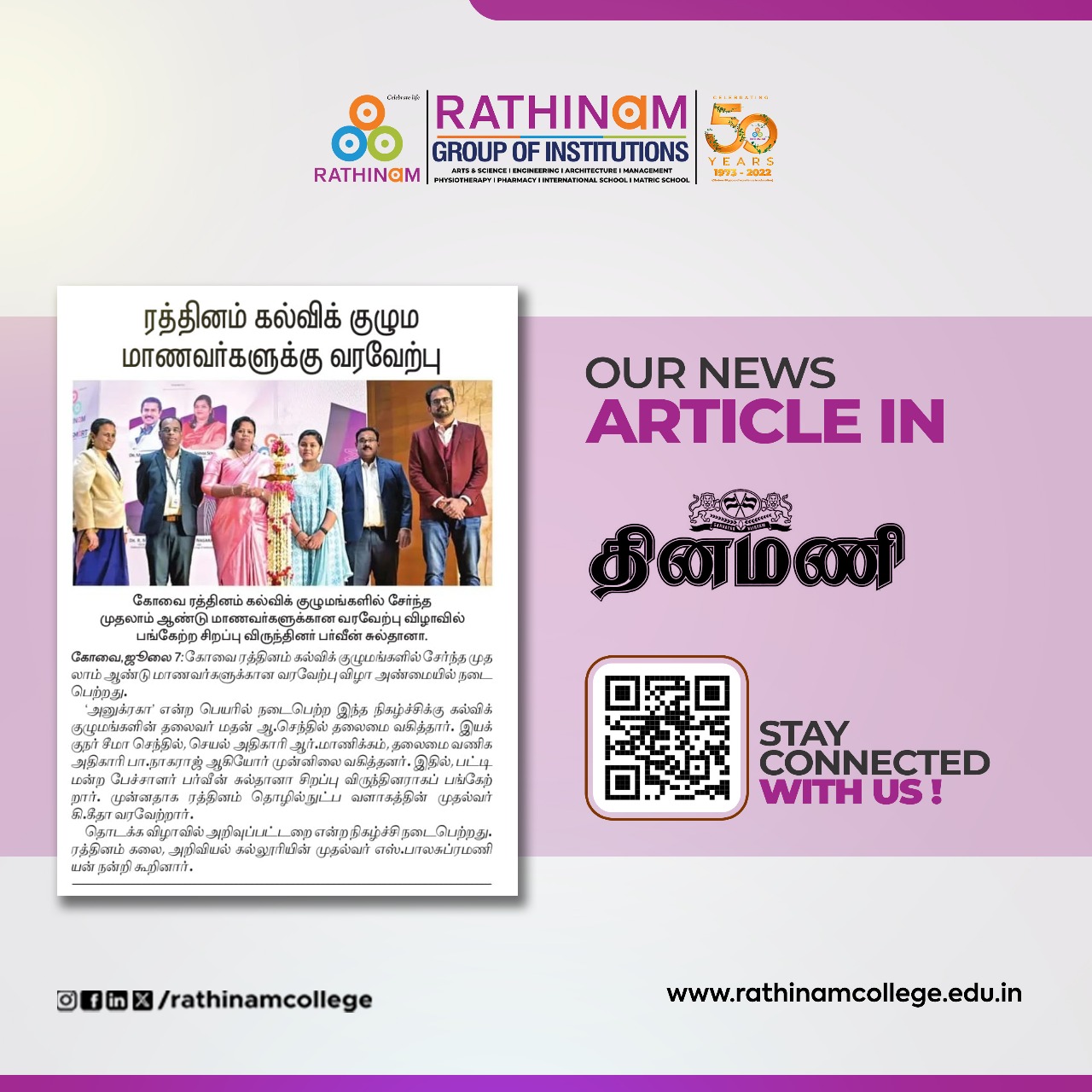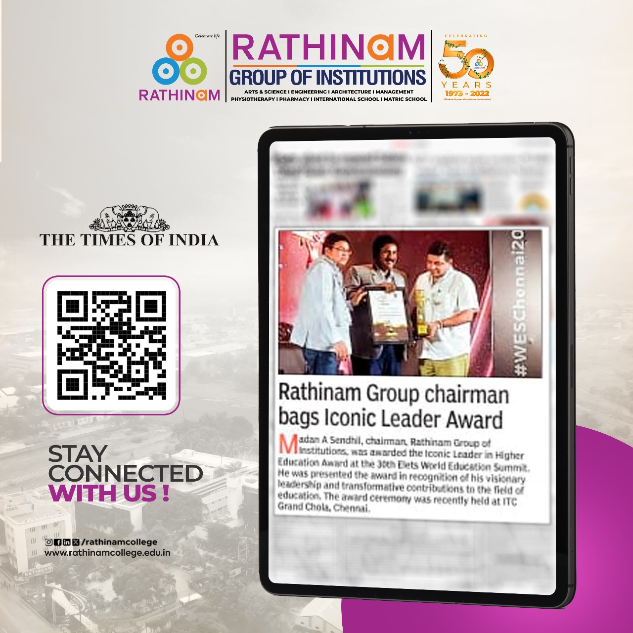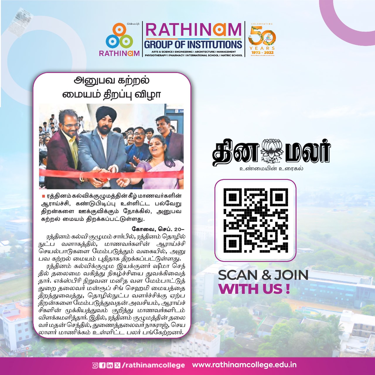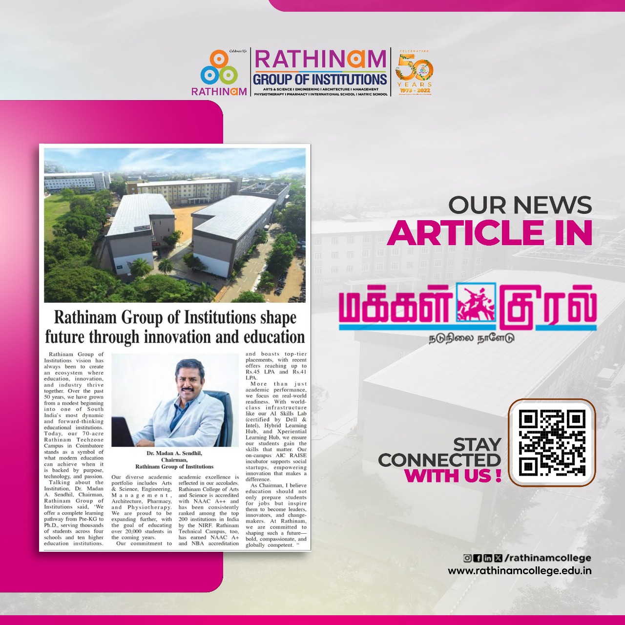 Rathinam College is one of the Best Colleges in Coimbatore, Tamilnadu. As a Top College in Coimbatore, We offer Arts & Science, Engineering, Management, Architecture & Physiotherapy courses. Rathinam began its journey more than 40 years ago with a vision to create an educational community with a global outlook. The dream kick-started when K.P.M Matriculation School was established in Eachanari, Coimbatore.