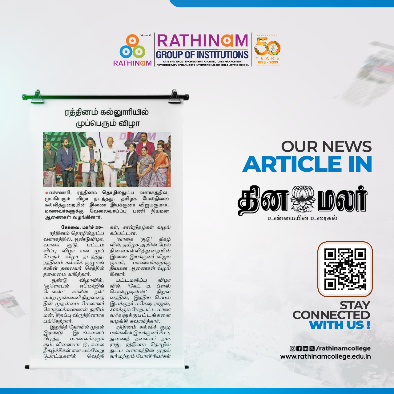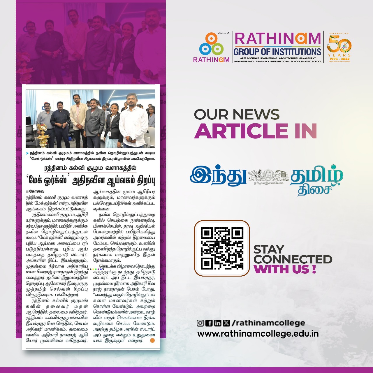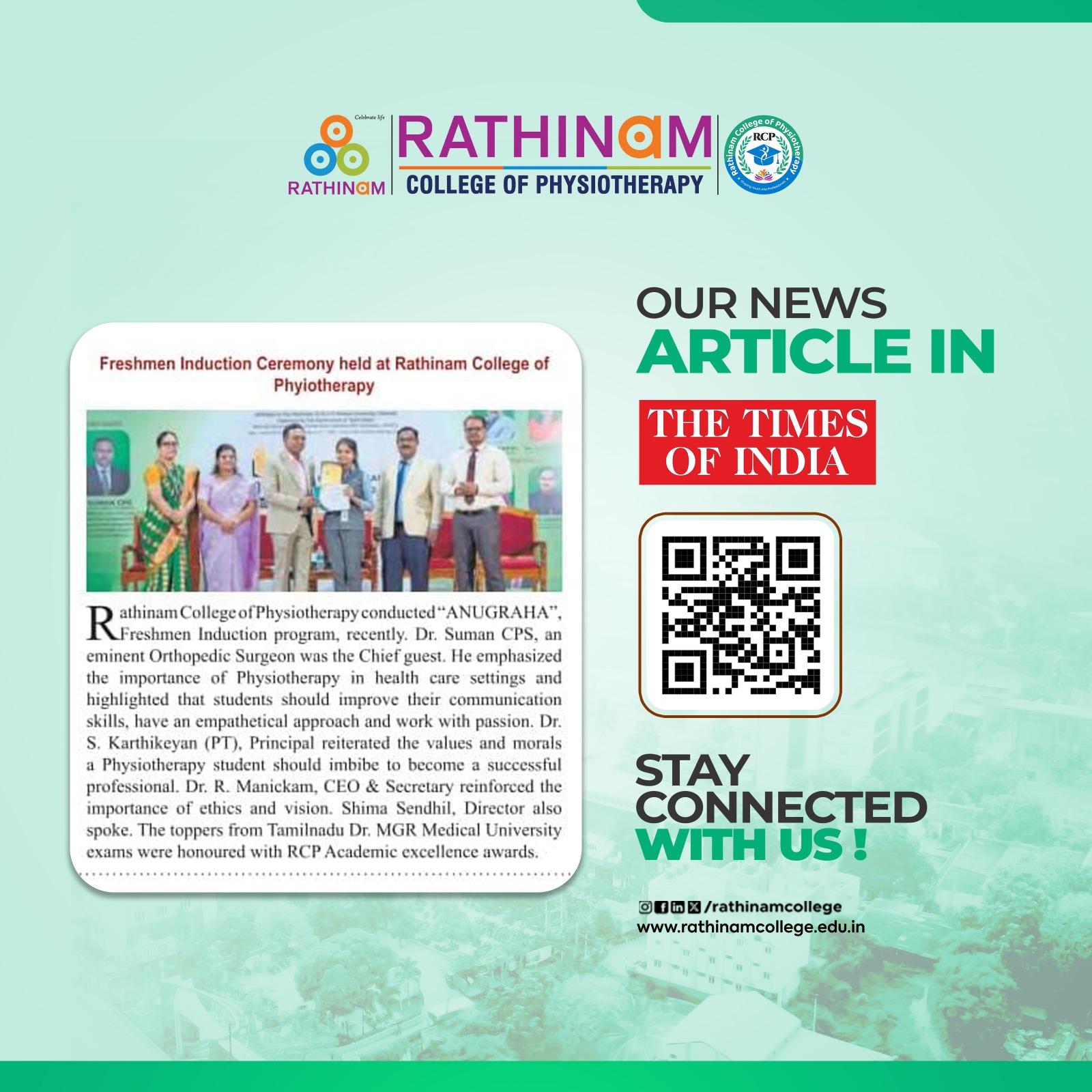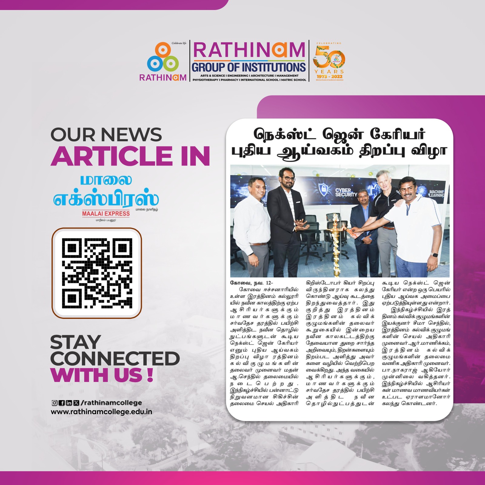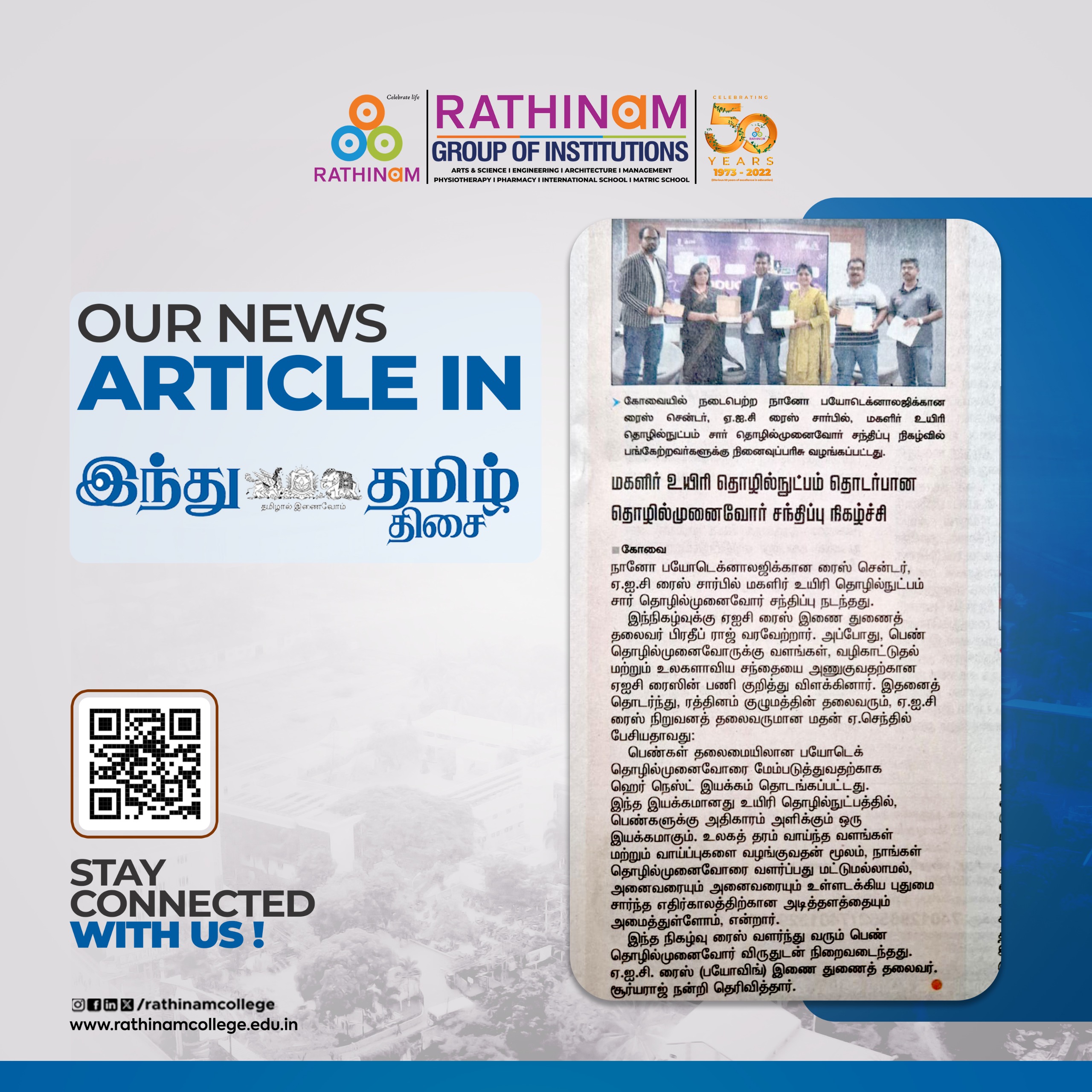 Rathinam College is one of the Best Colleges in Coimbatore, Tamilnadu. As a Top College in Coimbatore, We offer Arts & Science, Engineering, Management, Architecture & Physiotherapy courses. Rathinam began its journey more than 40 years ago with a vision to create an educational community with a global outlook. The dream kick-started when K.P.M Matriculation School was established in Eachanari, Coimbatore.