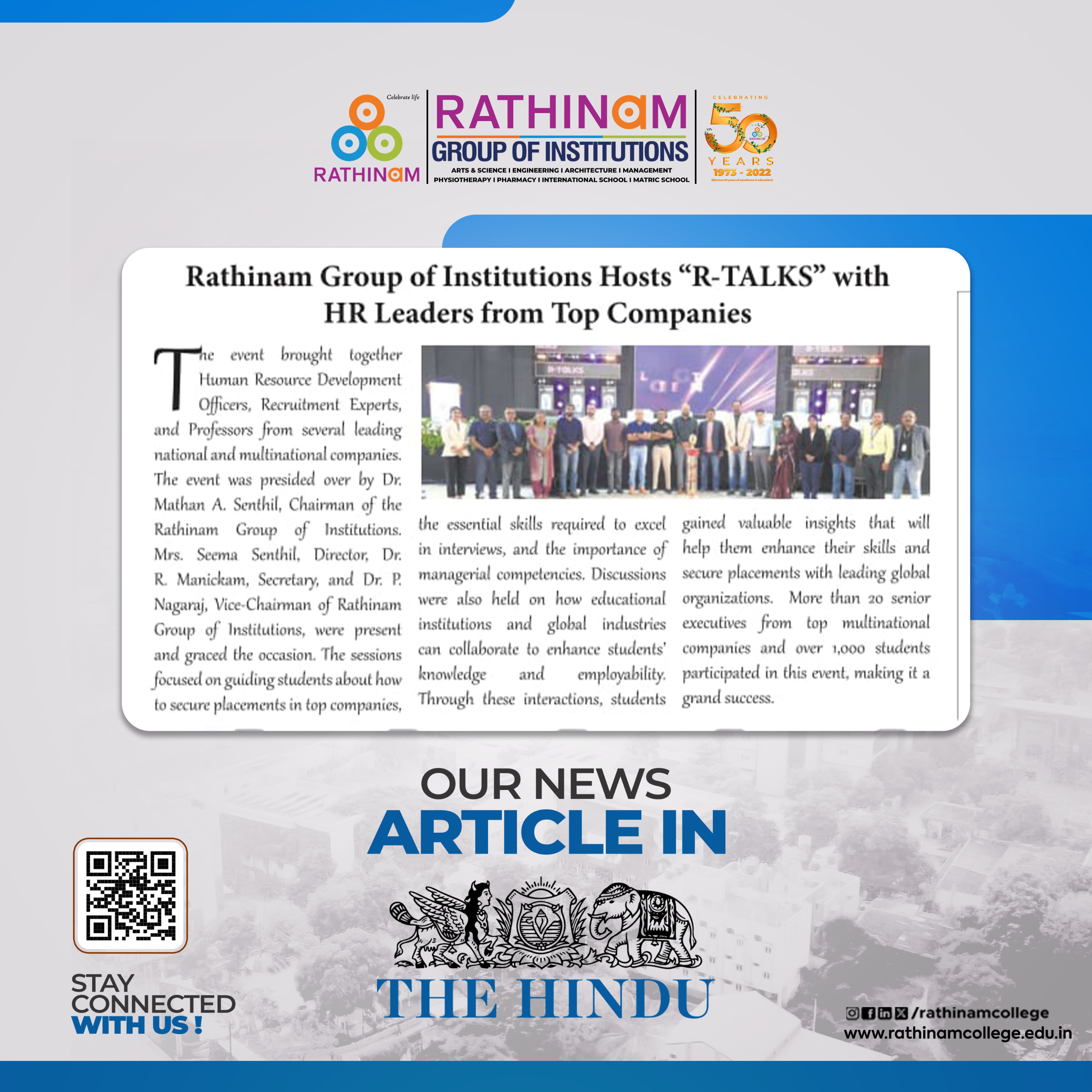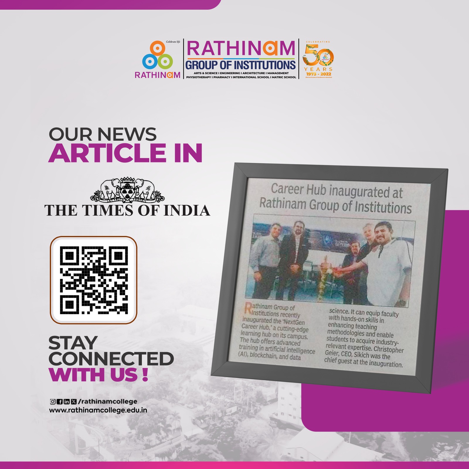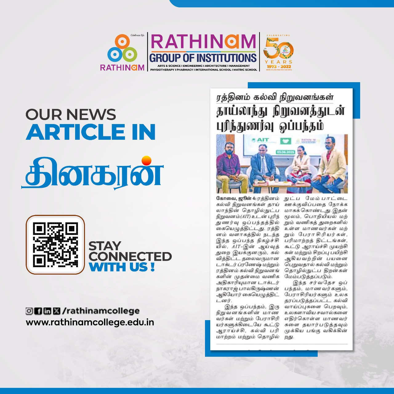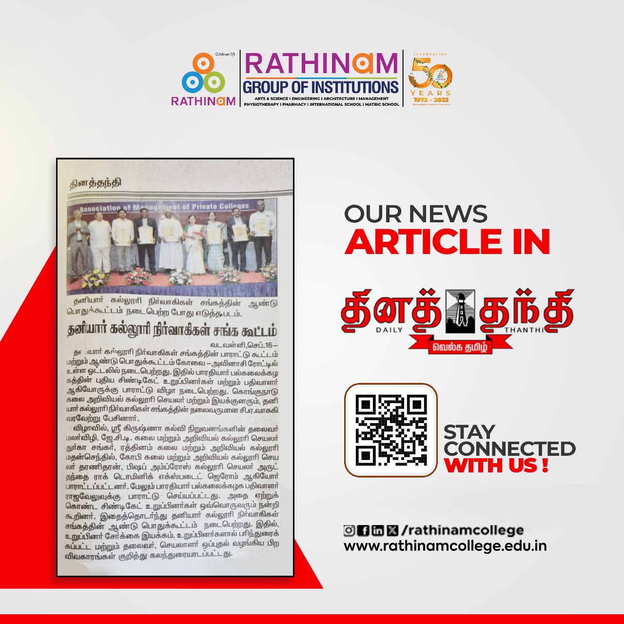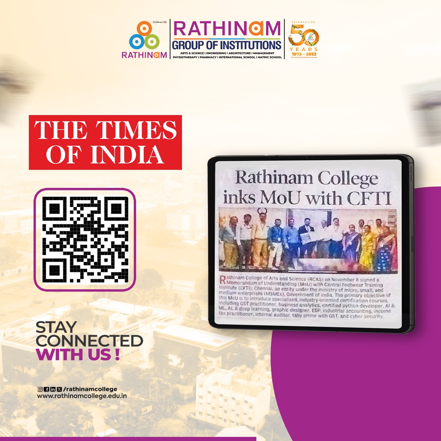 Rathinam College is one of the Best Colleges in Coimbatore, Tamilnadu. As a Top College in Coimbatore, We offer Arts & Science, Engineering, Management, Architecture & Physiotherapy courses. Rathinam began its journey more than 40 years ago with a vision to create an educational community with a global outlook. The dream kick-started when K.P.M Matriculation School was established in Eachanari, Coimbatore.