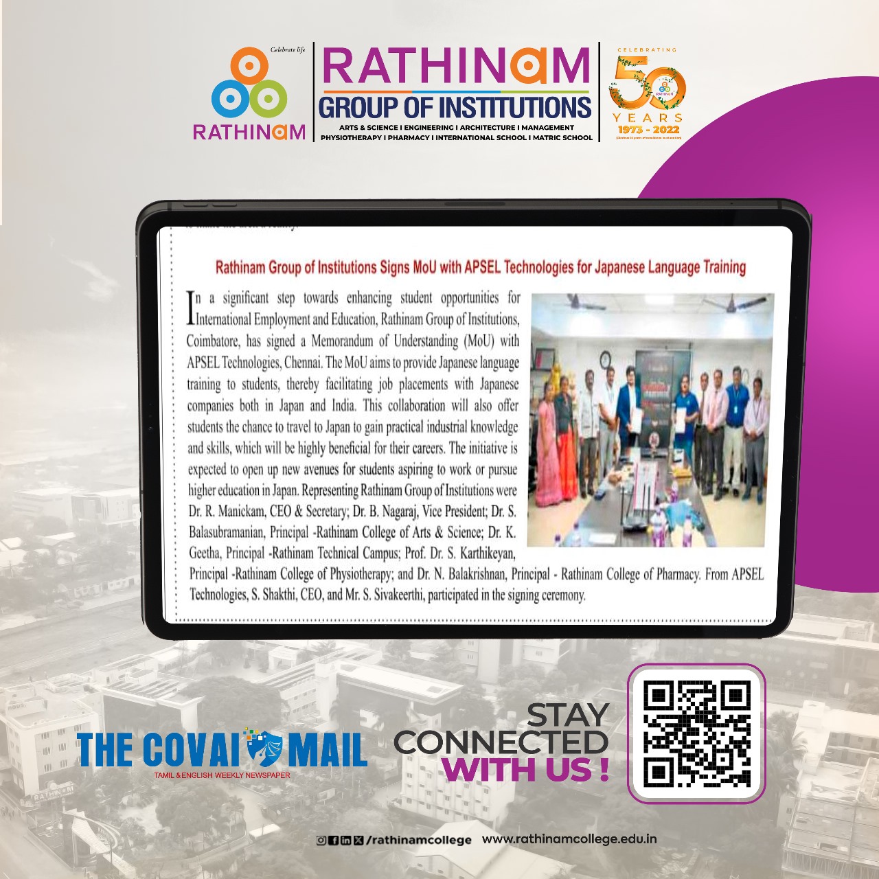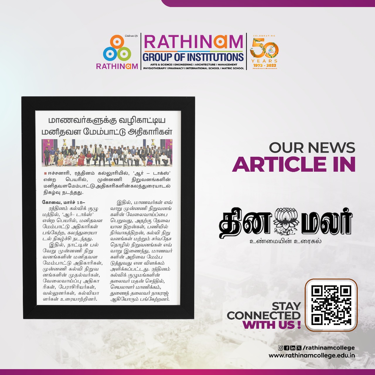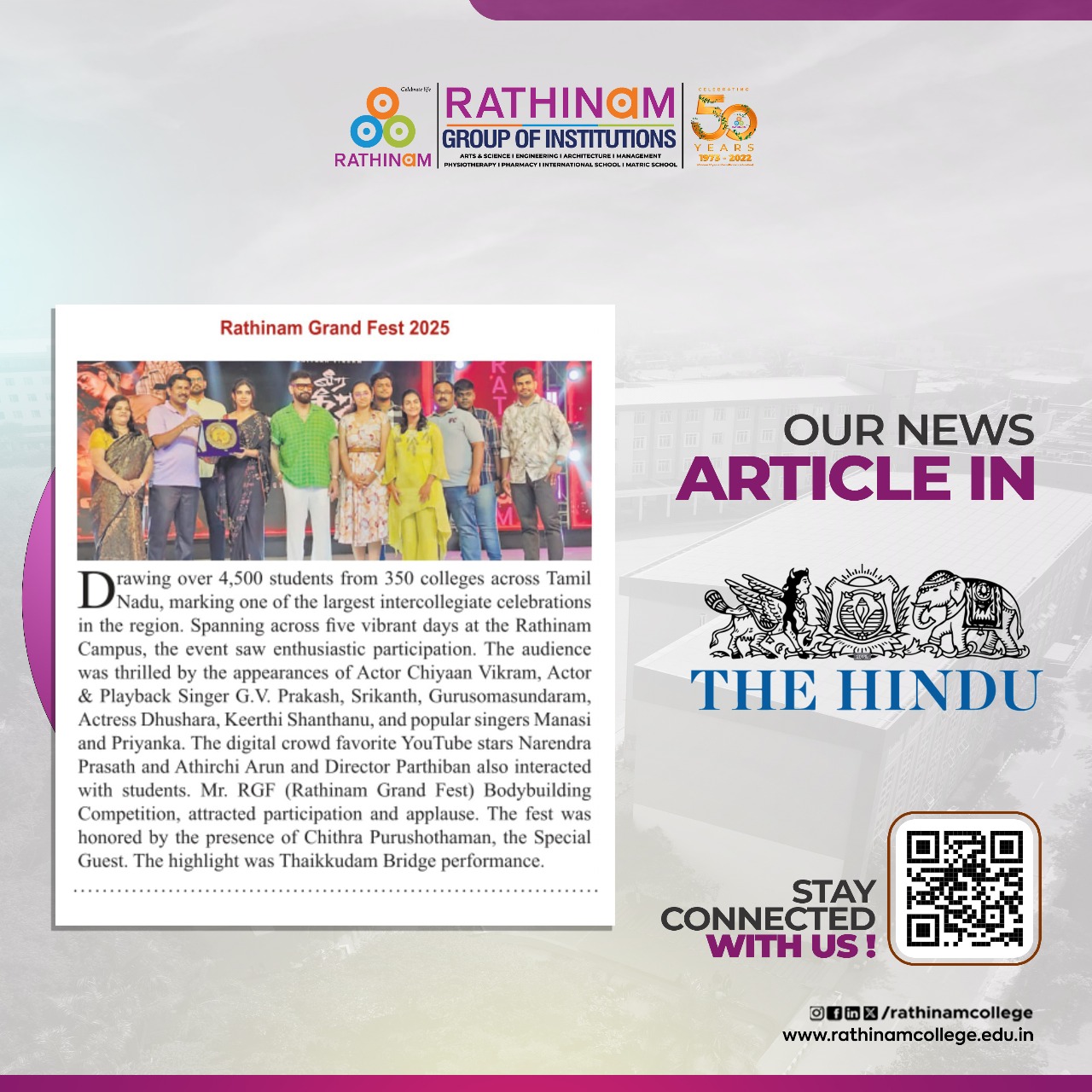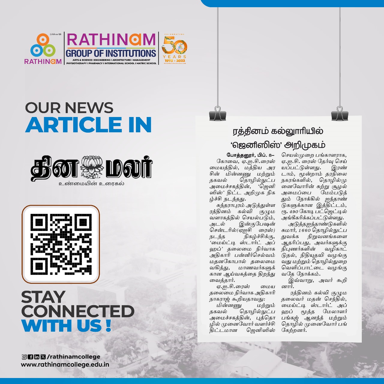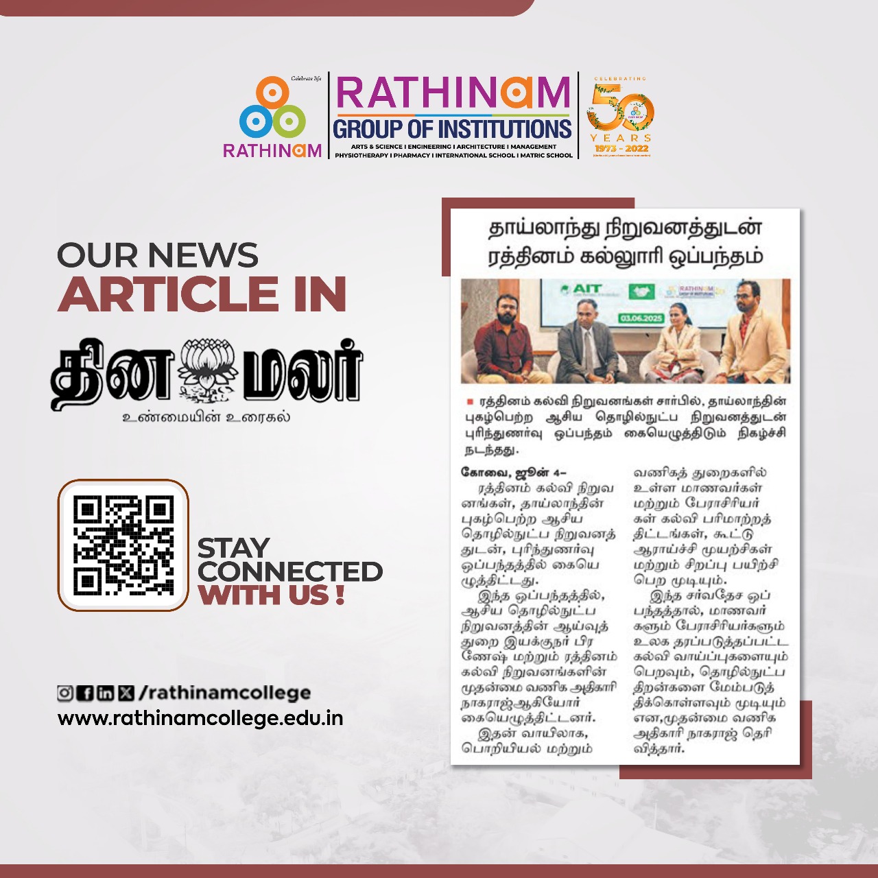 Rathinam College is one of the Best Colleges in Coimbatore, Tamilnadu. As a Top College in Coimbatore, We offer Arts & Science, Engineering, Management, Architecture & Physiotherapy courses. Rathinam began its journey more than 40 years ago with a vision to create an educational community with a global outlook. The dream kick-started when K.P.M Matriculation School was established in Eachanari, Coimbatore.