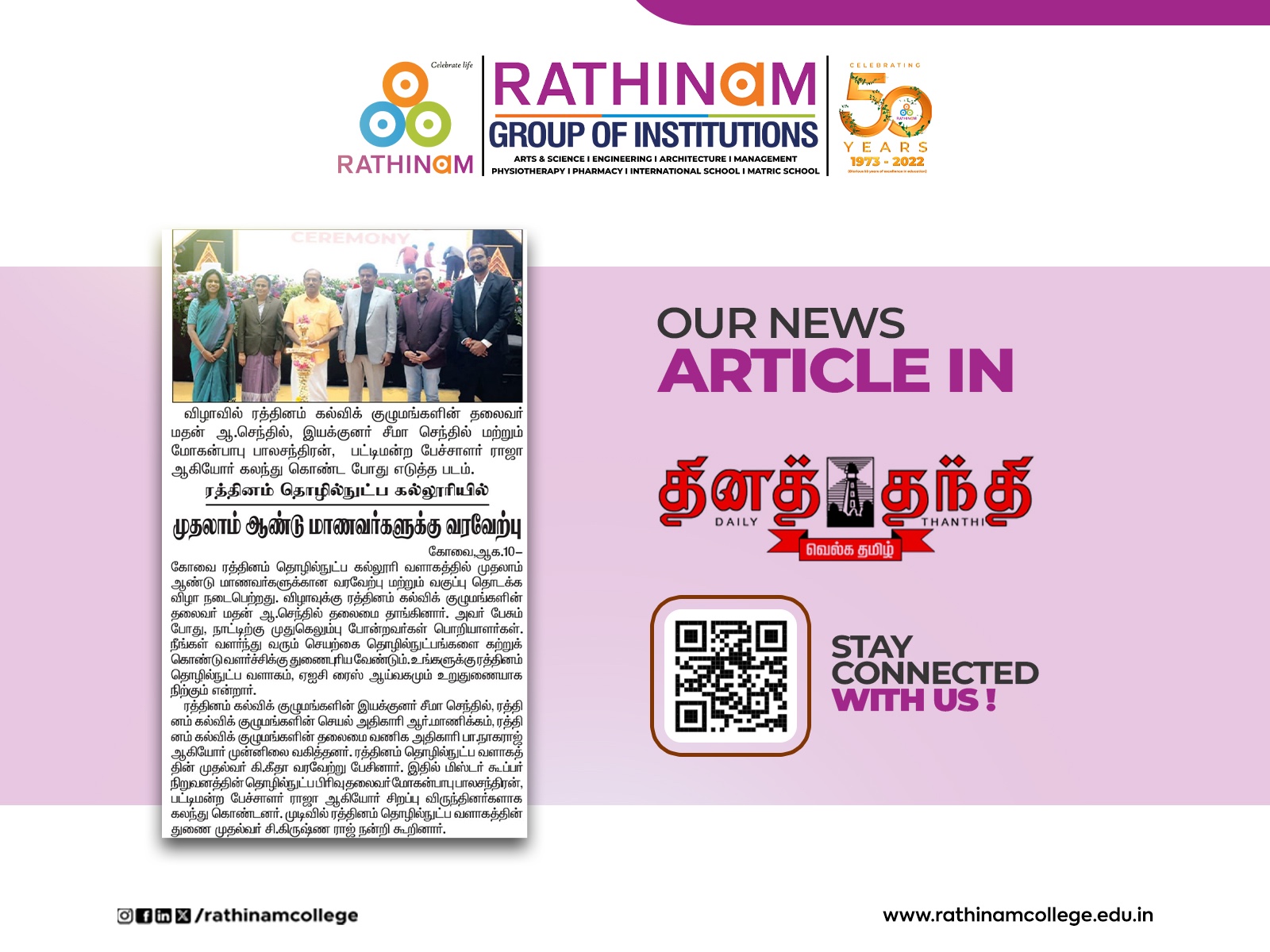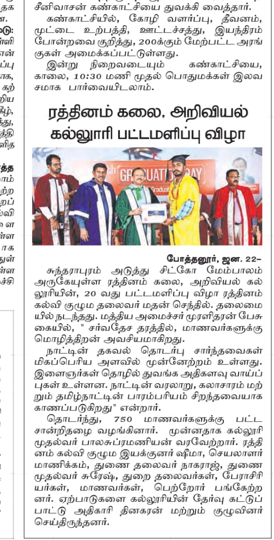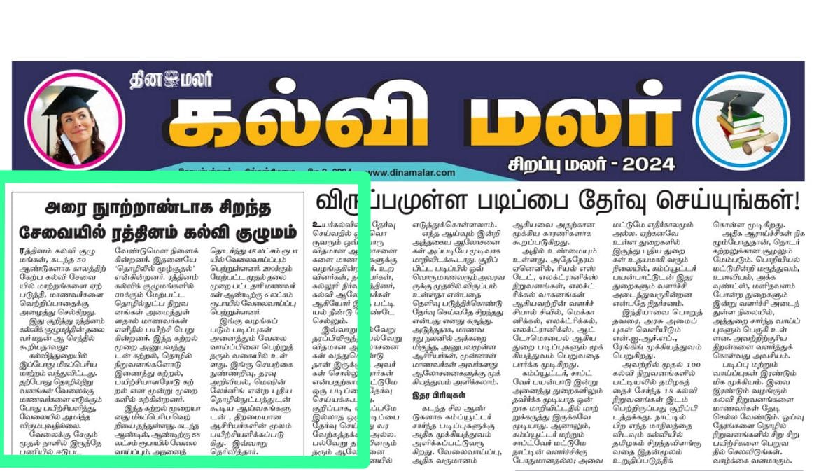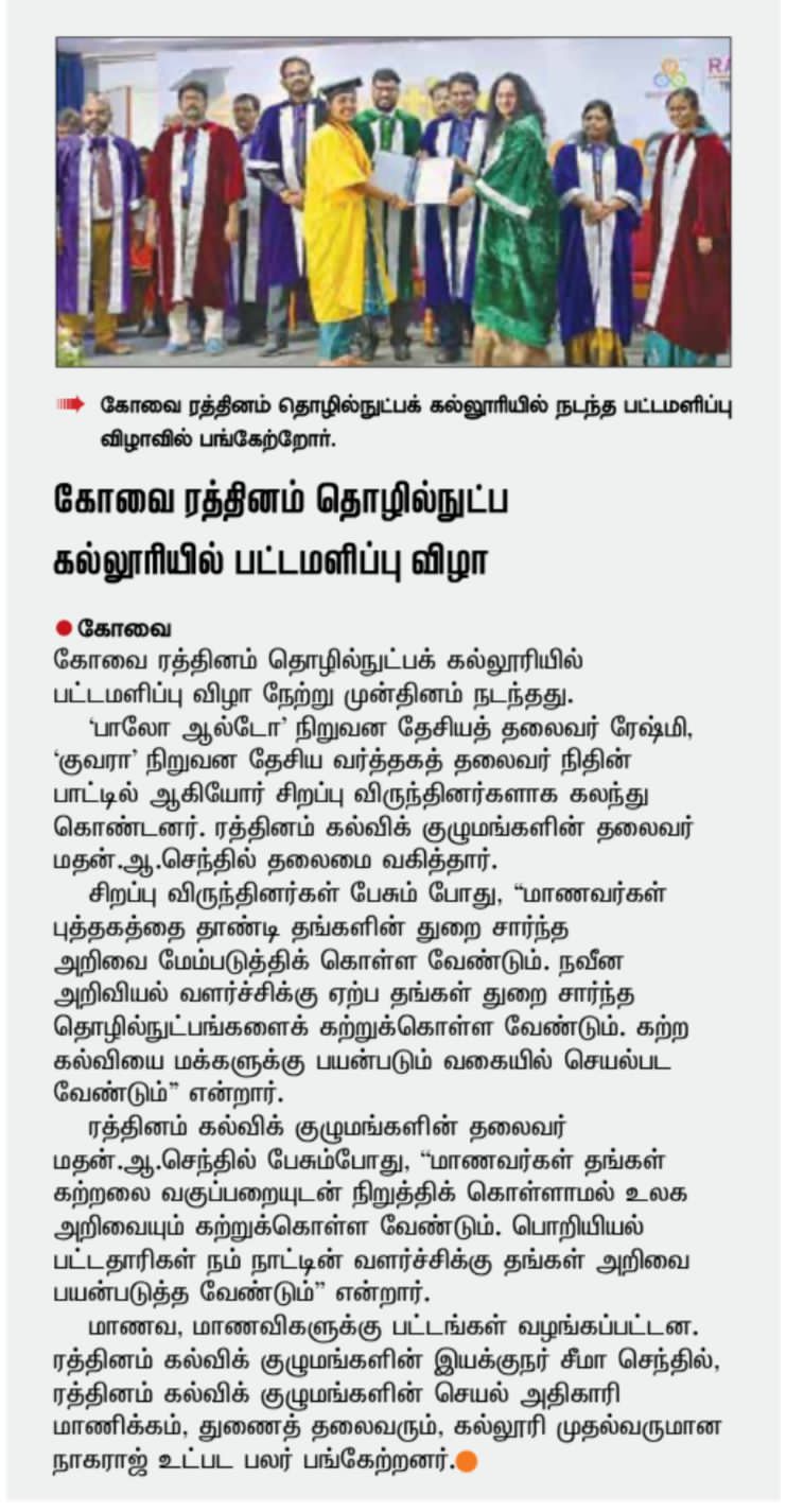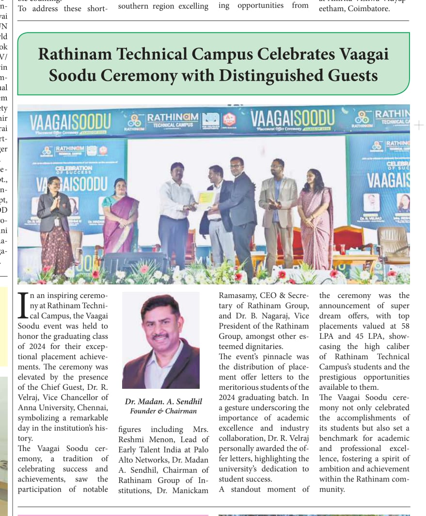Rathinam College is one of the Best Colleges in Coimbatore, Tamilnadu. As a Top College in Coimbatore, We offer Arts & Science, Engineering, Management, Architecture & Physiotherapy courses. Rathinam began its journey more than 40 years ago with a vision to create an educational community with a global outlook. The dream kick-started when K.P.M Matriculation School was established in Eachanari, Coimbatore.