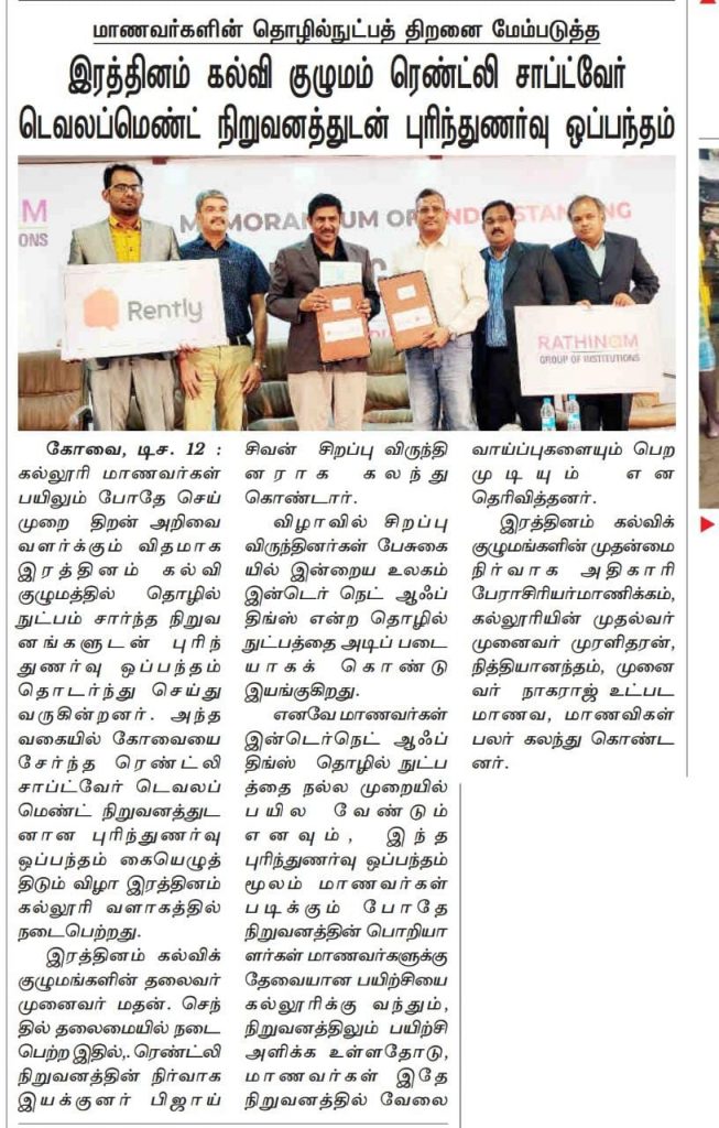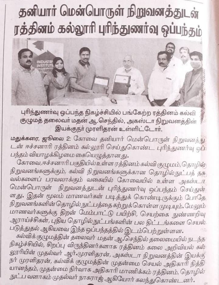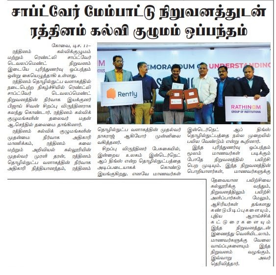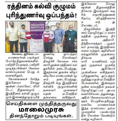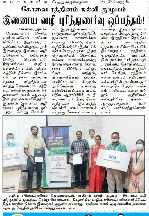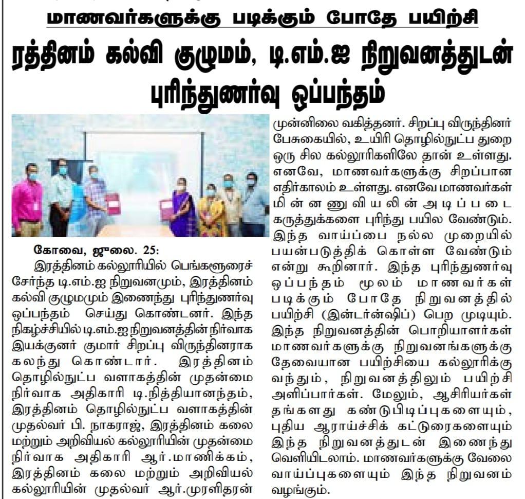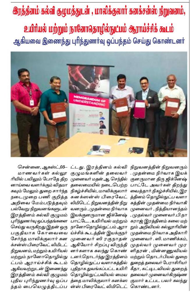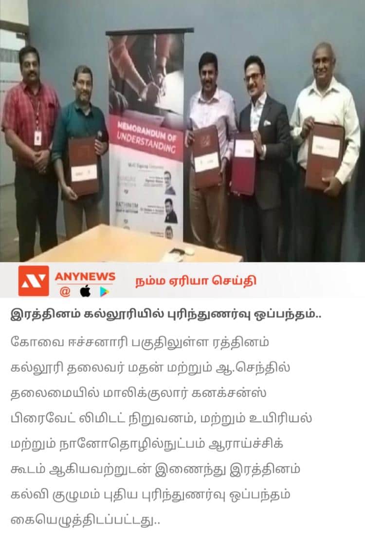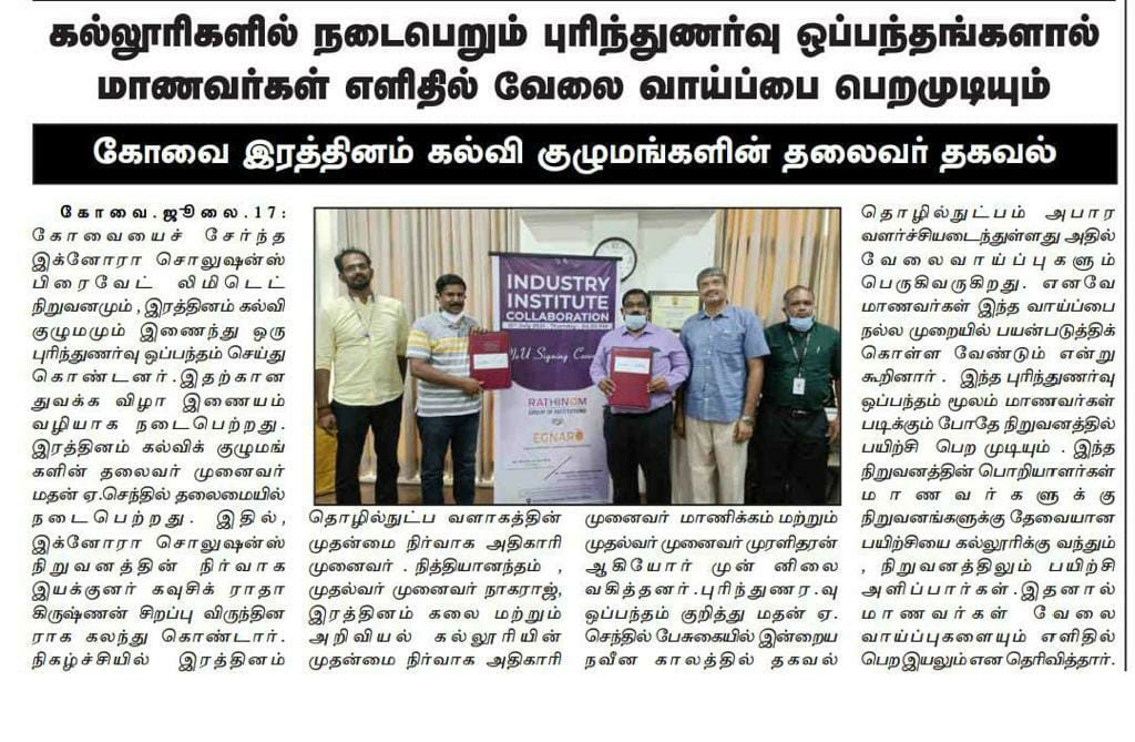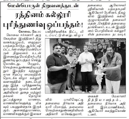 ரத்தினம் கல்லூரி காலிபர் இண்டர் கனெக்ட் சொல்யூசன்ஸ் நிறுவனத்துடன் புரிந்துணர்வு ஒப்பந்தம்