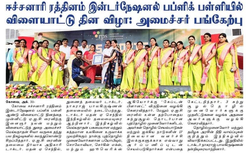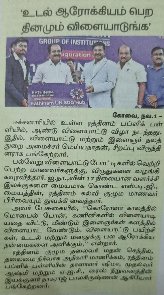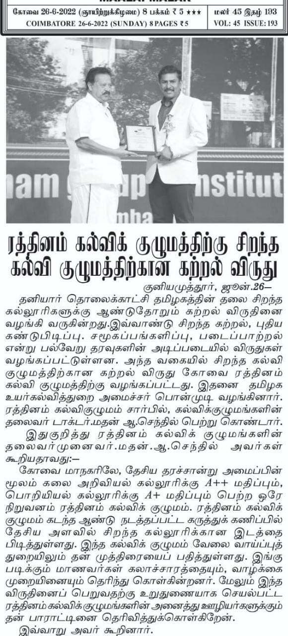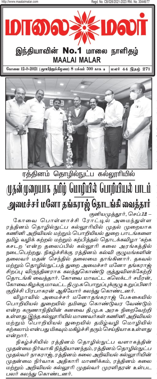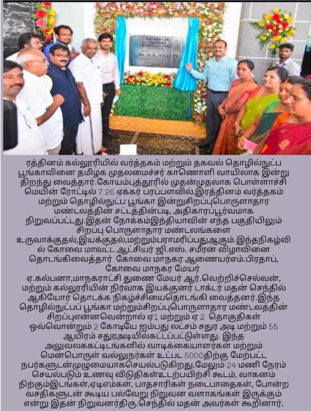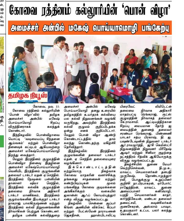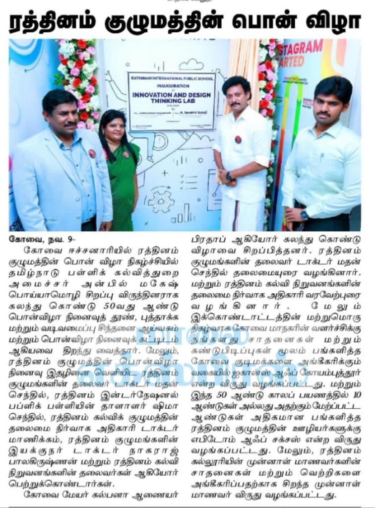 ஈச்சனாரியில் ரத்தினம் குழுமத்தின் பொன் விழா நிகழ்ச்சியில் மாண்புமிகு தமிழ்நாடு பள்ளிக் கல்வித்துறை அமைச்சர் உயர்திரு.அன்பில் மகேஷ் பொய்யாமொழி சிறப்பு விருந்தினராக கலந்து கொண்டு நிகழ்ச்சியை சிறப்பித்தார்.