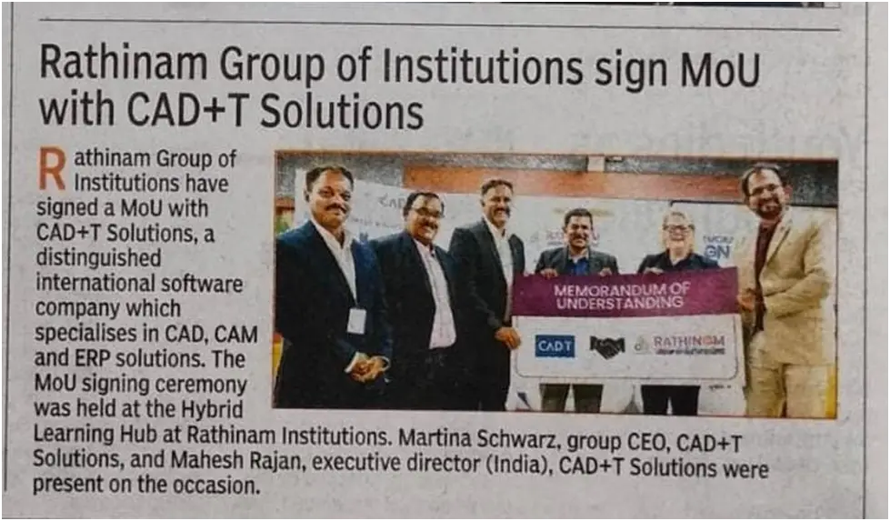 In the vibrant city of Coimbatore, known for its rich educational heritage, Rathinam Group of Institutions stands out as a beacon of excellence and innovation. The recent Memorandum of Understanding (MoU) signed between Rathinam Group of Institutions and CAD+T Solutions is a testament to their commitment to providing top-tier education and practical industry exposure to their students. This strategic partnership, which focuses on CAD, CAM, and ERP solutions, underscores Rathinam’s position as one of the best colleges in Coimbatore, continually striving to enhance the academic and professional prospects of its students.
